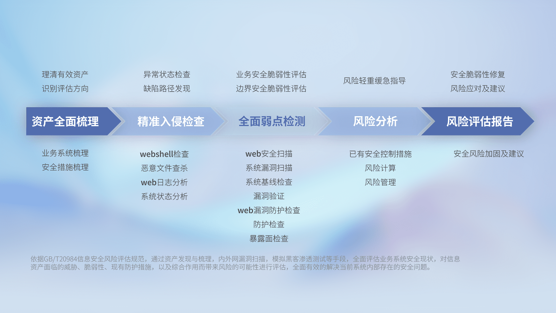针对客户行业特性,,,,以专业的安全服务+多厂商联合解决方案提供专属的一站式安全管理服务,,,,帮助客户全面感知网络空间威胁,,基于识别、、检测、、分析、、、、防护、、、、监测、、、、响应的服务理论模型,,,从方案咨询、、集成交付、、、评估验证、、、优化加固、、、、运维运营,,,致力于为客户提供完整的闭环管理式安全服务。。以实战经验为客户打造高抵御风险的安全体系,,帮助客户发现威胁、、、、对抗威胁、、、处置威胁,,不断积累安全对抗能力,,持续保障数字化安全。。